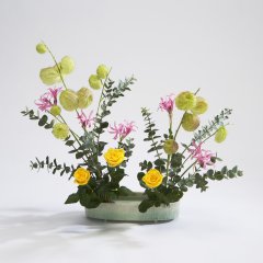 花材=紅葵、ワックスフラワー、ニューサイラン